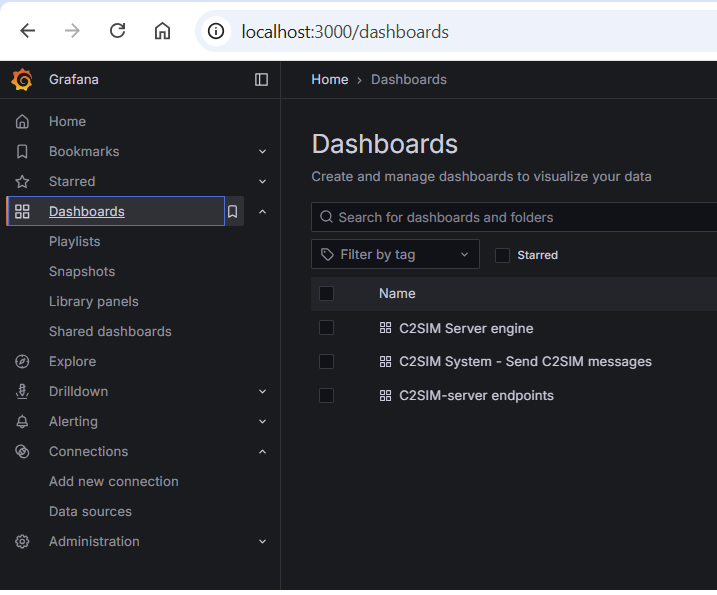 In docker\prometheus\prometheus.yml is configured that Prometheus should scrape the endpoint c2sim-server:7777 every 5 sec. Because the c2-sim server and Prometheus run the the same docker container this works with localhost and an internal port number. In docker\grafana\provisioning\datasources\datasource.yml a data source is created for Prometheus that uses Prometheus to query time serie-data. The Grafana dashboards are automatically loaded from the folder grafana\provisioning\dashboards.